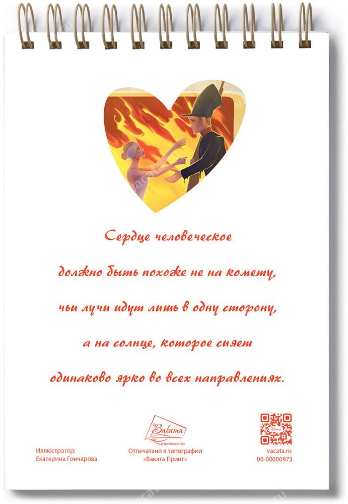 Надпись на обложке — «Пламя сердца». Надпись на последней странице обложки: «Сердце человеческое должно быть похоже не на комету, чьи лучи идут лишь в одну сторону, а на солнце, которое сияет одинаково ярко во всех направлениях»