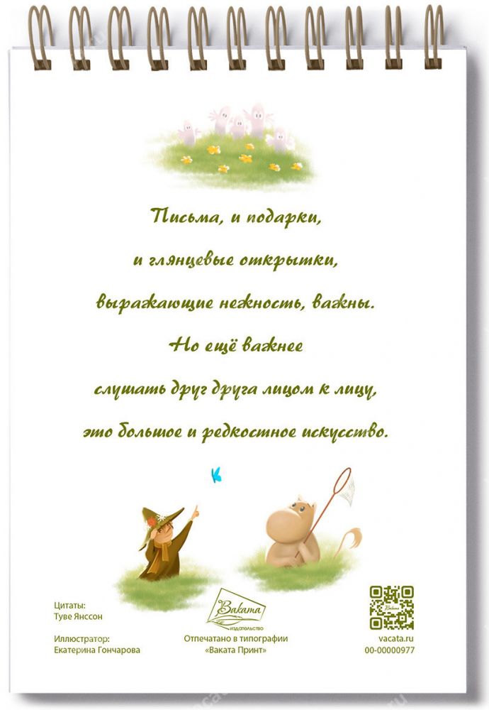 Надпись на обложке — «Всегда живи настоящим».  Надпись на последней странице обложки: «Письма, и подарки, и глянцевые открытки, выражающие нежность, очень важны. Но еще важнее слушать друг друга лицом к лицу, это большое и редкостное искусство»