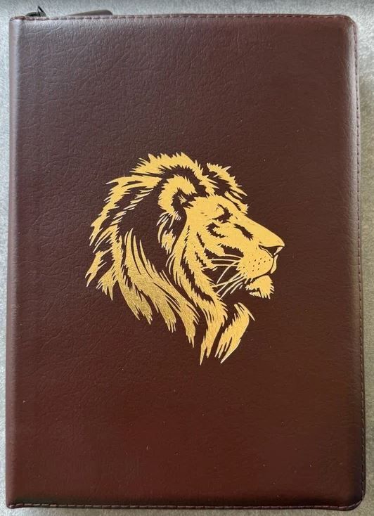Дизайн обложки "Золотой лев", переплет из эко кожи на молнии, индексы.