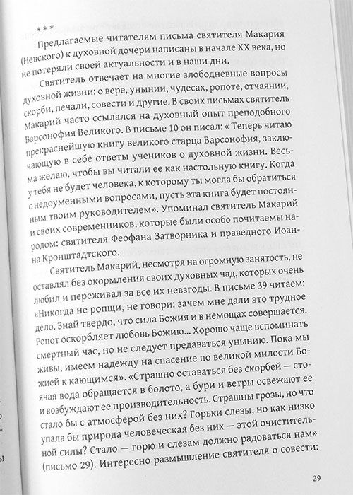 Предлагаемая читателям книга содержит письма святителя Макария (Невского), митрополита Московского, Алтайского, адресованные духовной дочери, начальнице монашеской общины и приюта для девочек-сирот. С момента написания этих писем прошло более века, но темы, в них затрагиваемые, не потеряли своей актуальности и сегодня. Святитель Макарий умел утешить скорбящую душу, осторожно предупредить о грядущих испытаниях. Все его письма наполнены истинной любовью и сердечным теплом, которых так часто не хватает каждому из нас.