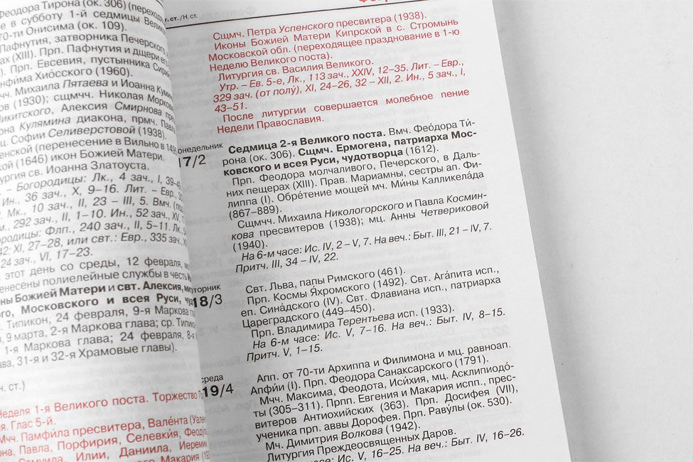 Данный календарь является аналогом официального календаря Русской Православной Церкви. Издание включает полный месяцеслов, указатель чтений Священного Писания, указатель имён святых и указатель икон Божией Матери. Удобный формат. Календарь имеет небольшую толщину за счет использования специальной тонкой белой бумаги. Подходит как для священнослужителей, так и для мирян.