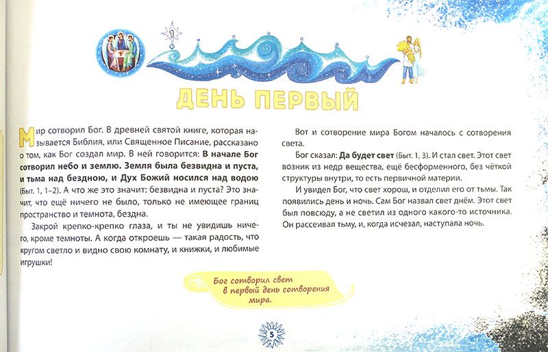 Для многих детей эта книга будет первым знакомством со Священным Писанием. Библейский рассказ о сотворении мира сопровождается замечательным иллюстративным рядом.