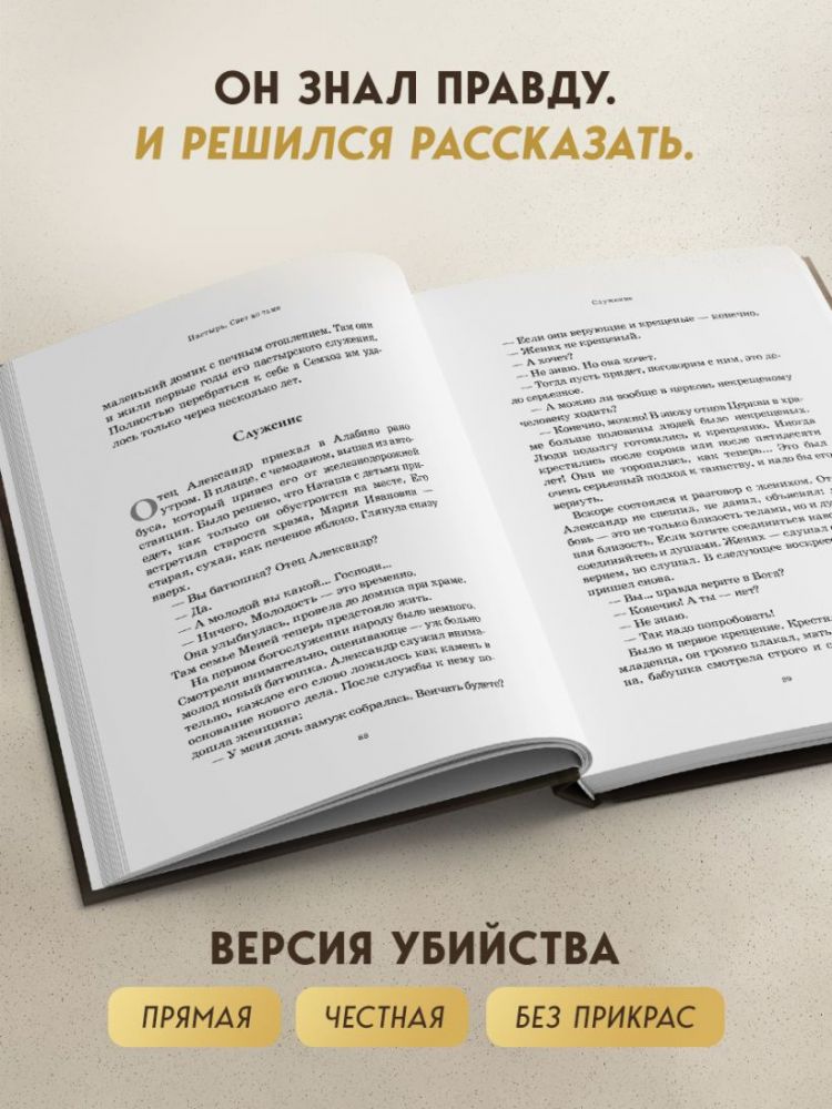«Пастырь. Свет во тьме» — это литературно переработанная история жизни и мученической смерти протоиерея Александра Меня — одного из самых светлых, популярных и противоречивых православных священников XX века. Книга охватывает масштабную биографию героя, его внутреннюю эволюцию, борьбу с системой, взаимоотношения с КГБ, церковным руководством и диссидентской средой, а также последние дни его жизни, оборвавшейся в 1990 году от удара топором.