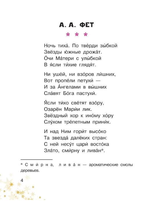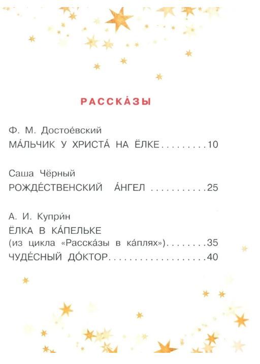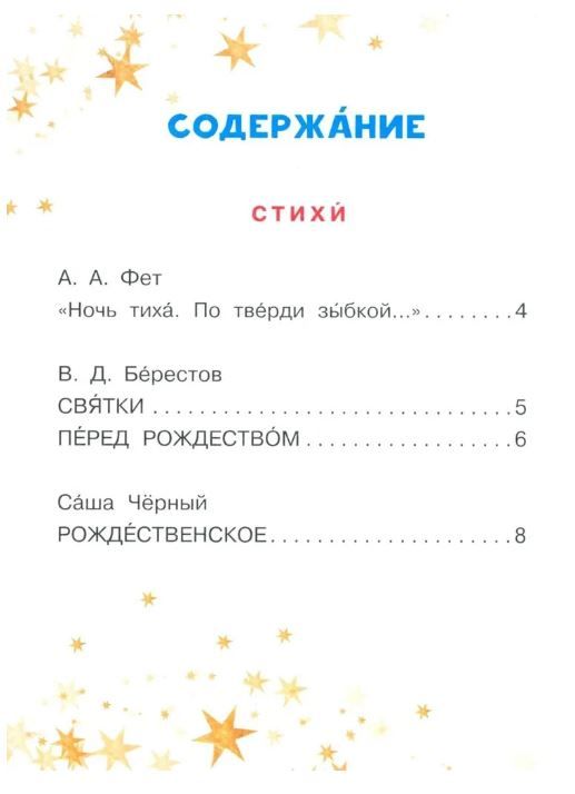 В книгу вошли трогательные стихи и рассказы, посвящённые светлому празднику Рождества Христова. Произведения Ф.М. Достоевского, А.И. Куприна, С. Чёрного и других выдающихся отечественных авторов раскрывают традиции и обычаи русской культуры, приобщают к лучшим человеческим ценностям. Они вызовут в детях самые добрые чувства, научат сопереживать.