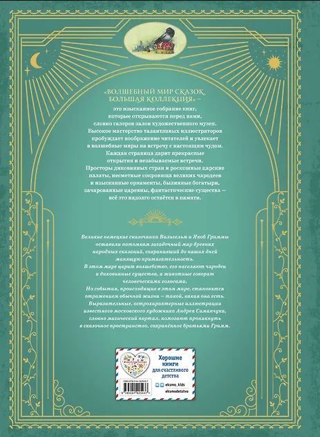 Книги серии «Волшебный мир сказок. Большая коллекция» — это приглашение в удивительное путешествие по таинственным мирам, ставшим зримыми и осязаемыми благодаря искусству художников. Лучшие мастера книжной иллюстрации подарят вам незабываемые впечатления от встречи со сказкой.