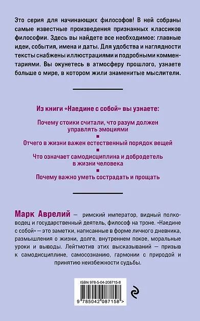 «Наедине с собой» — походные записки римского императора Марка Аврелия, в которых он размышляет об общем благе, взаимоотношениях людей, добродетелях, экономике и др. Идея быстротечности жизни, которая зависит от судьбы, лейтмотивом проходит через весь сборник. По мнению Марка Аврелия, в трудные времена только философия может утешить и стать единственной опорой в жизни.