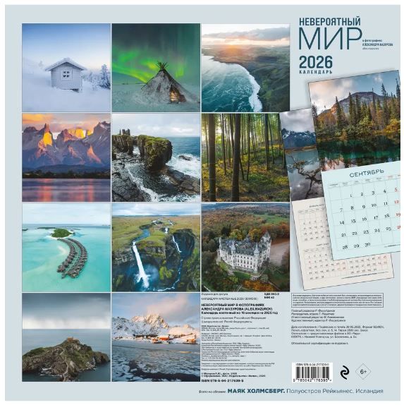 В календаре «Невероятный мир» известный фотограф Александр Мазуров решил собрать самые красивые и атмосферные места мира, в которых он когда-либо бывал. Бескрайние просторы России, бирюзовые воды Мальдив, готические замки Шотландии, бесчисленные водопады Исландии, величественные горы Чили и захватывающее северное сияние в Норвегии — все это и многое другое ждет вас на страницах календаря!