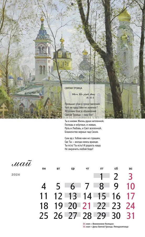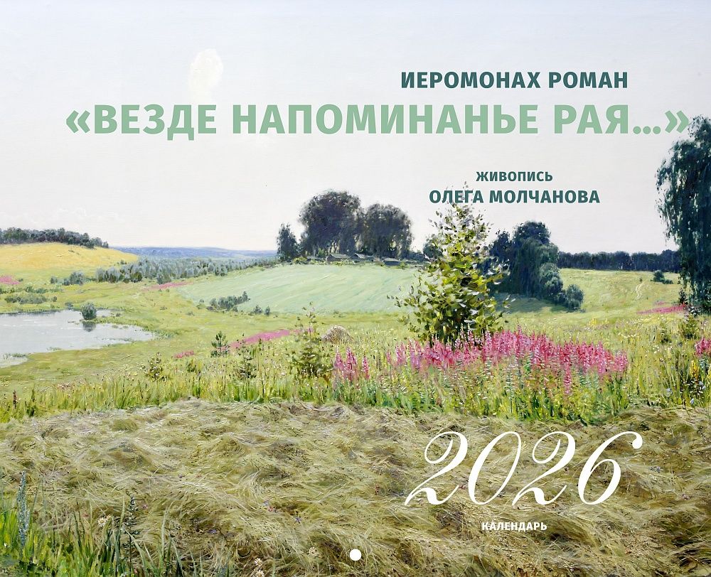 Календарь на 2026 год называется «Везде напоминанье Рая…» — это строчка из стихотворения отца Романа. Помимо двенадцати стихотворений, в календарь включены фрагменты работ известного живописца Олега Молчанова. Художник живёт в Москве, но почти все его работы, вошедшие в календарь, были написаны в глубинке — в Ивановской, Владимирской, Костромской земле. По словам самого Олега Молчанова, его иногда упрекают в том, что на картинах почти нет людей — но мне, редактору, это было по душе, и я старалась выбрать наиболее «безлюдные» работы, хотя иногда о человеческом присутствии всё же напоминает то дым из трубы, то Кресты на погосте. Олег Молчанов рассказывает, что никогда не пишет по фотографиям — только с натуры, и в каждой работе отражается и мороз, и жара, и ветер, которые приходилось терпеть, а дома почти ничего не дорабатывает.