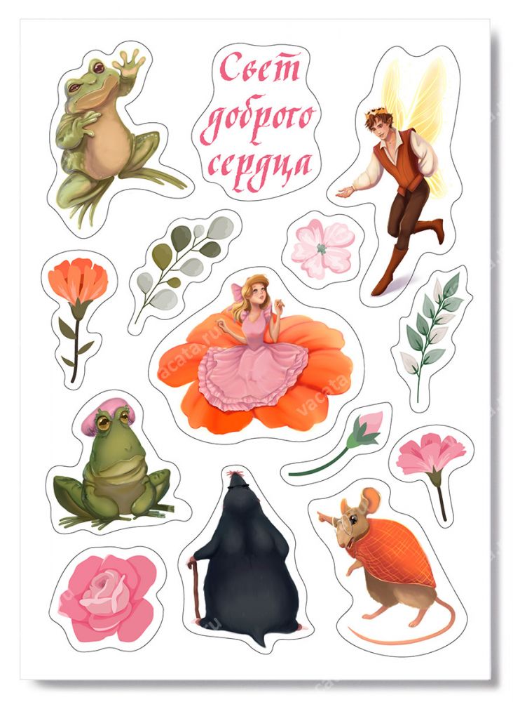 Набор стикеров (наклеек), вдохновленных вдохновлена сказкой датского писателя Ганса Христиана Андерсена «Дюймовочка», поэтому особенно понравится детям и подросткам. А также, конечно, всем любителям знаменитой сказки независимо от возраста. Здесь вы найдете изображения Дюймовочки, Эльфа, крота, ласточки, жабы, цветов... А также надпись: «Свет доброго сердца». Стикеры напечатаны на одном листе с контурной резкой для удобства использования. Наклейки могут использоваться для украшения предметов, выражения индивидуальности, чтобы сообщить окружающим о своем настроении и интересах.