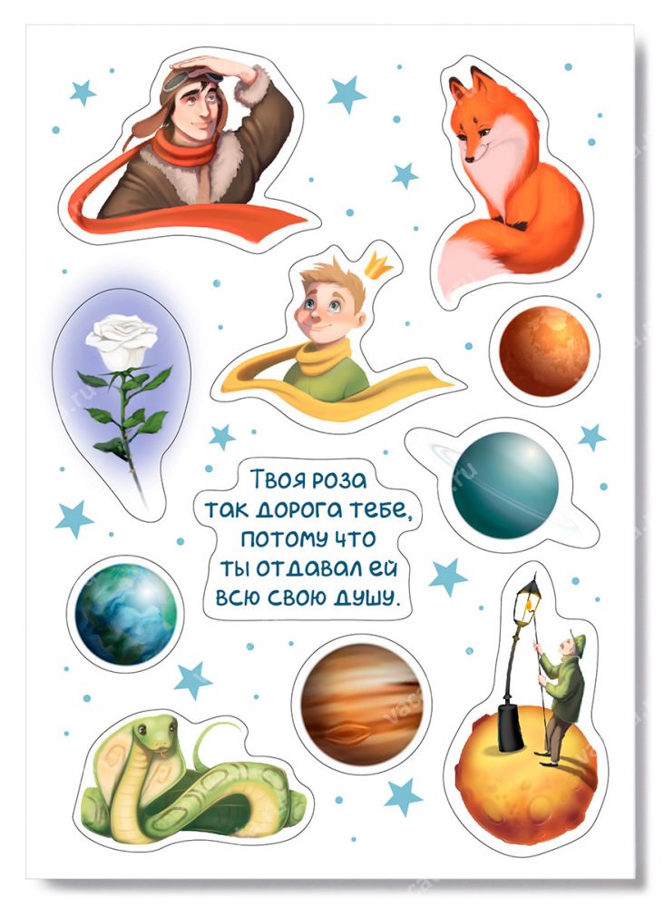 Набор стикеров (наклеек), вдохновленных историей про Маленького принца, известного персонажа сказки французского писателя Антуана Де Сент-Экзюпери. Здесь вы найдете Лиса, Пилота, Маленького принца, розу, звезды, планеты... А также надпись: «Твоя роза так дорога тебе потому, что ты отдавал ей всю свою душу». Стикеры напечатаны на одном листе с контурной резкой для удобства использования. Наклейки могут использоваться для украшения предметов, выражения индивидуальности, чтобы сообщить окружающим о своем настроении и интересах.