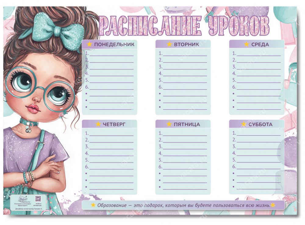 Расписание уроков — незаменимый помощник школьника. А это расписание создано специально для школьниц, которые любят яркие детали и красивый дизайн. Милый персонаж с большими глазами, модные аксессуары и нежные пастельные оттенки делают плакат настоящим украшением комнаты. Помимо шаблонов для каждого дня недели, оно содержит высказывание «Образование — это подарок, которым вы будете пользоваться всю жизнь».