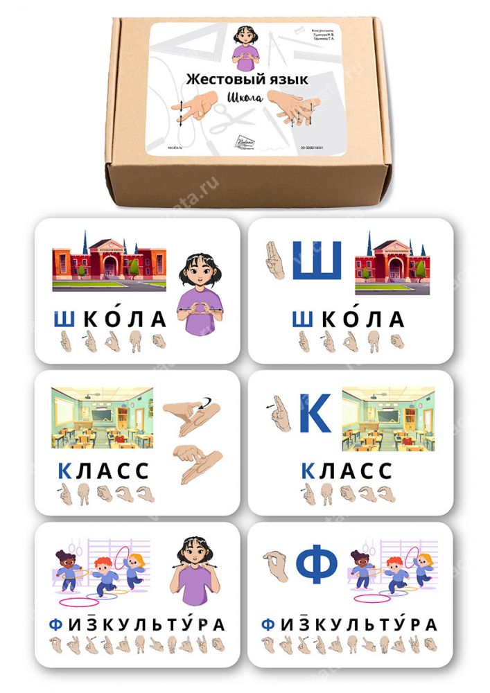 Карточки с такими словами, как «школа», «класс», «физкультура», предназначены для обучения глухих и слабослышащих детей. Понятия представлены на карточках как в виде жестов, так и в виде дактиля (побуквенно).