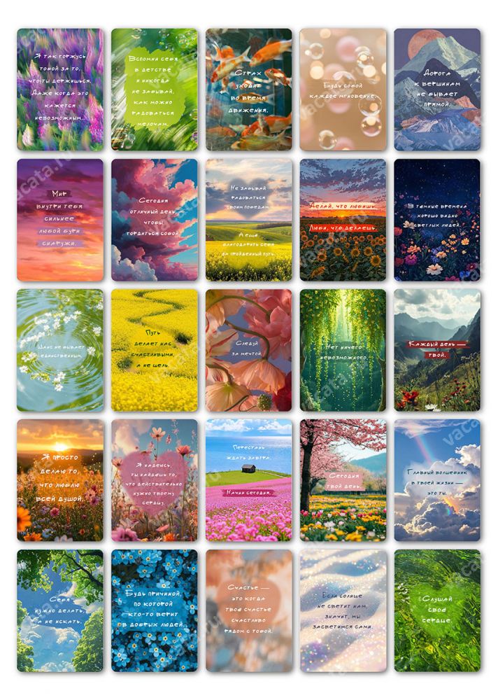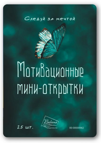Комплект мотивационных карточек «Следуй за мечтой» состоит из 25 небольших открыток формата А7, объединенных темой отношения человека с самим собой и помогающих ему следовать своим идеалам. Поиски настоящего счастья, деятельное созидание себя, культивирование своих лучших качеств, умение следовать своей мечте — вот лишь некоторые темы высказываний, которые вы найдете на каждой такой небольшой открытке. На лицевой стороне размещен мотивирующий текст на фоне красивой картинки.