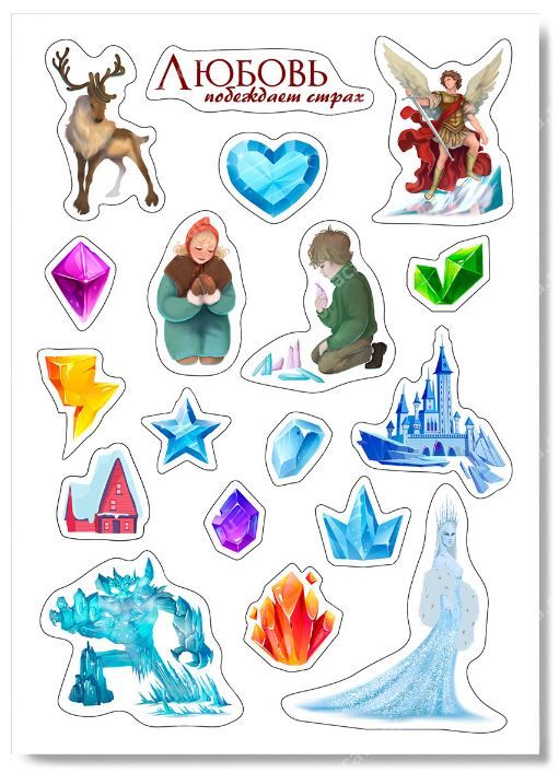 Набор стикеров (наклеек) вдохновлен сказкой датского писателя Ганса Христиана Андерсена «Снежная королева», поэтому особенно понравится детям и подросткам. А также, конечно, всем любителям знаменитой сказки независимо от возраста. Здесь вы найдете изображения Снежной Королевы, Кая, Герды, других персонажей сказки. А также надпись «Любовь побеждает страх». Стикеры напечатаны на одном листе с контурной резкой для удобства использования. Наклейки могут использоваться для украшения предметов, выражения индивидуальности, чтобы сообщить окружающим о своем настроении и интересах.