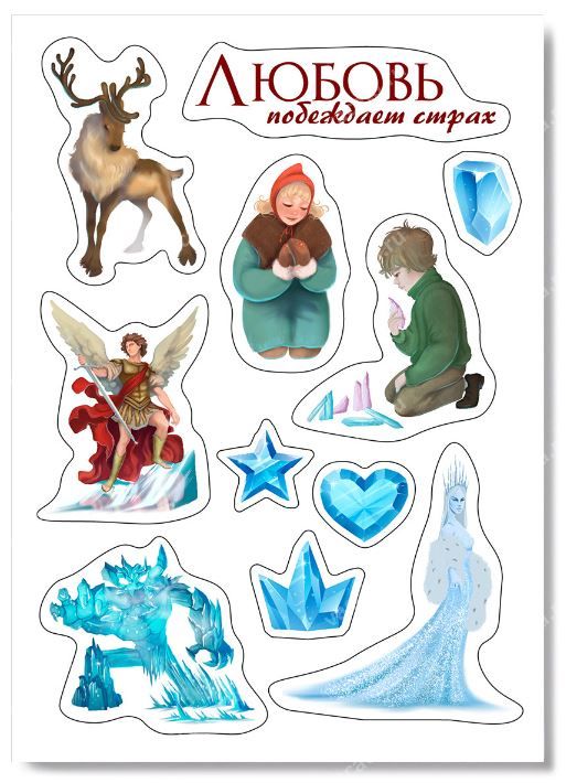Набор стикеров (наклеек) вдохновлен сказкой датского писателя Ганса Христиана Андерсена «Снежная королева», поэтому особенно понравится детям и подросткам. А также, конечно, всем любителям знаменитой сказки независимо от возраста. Здесь вы найдете изображения Снежной Королевы, Кая, Герды, других персонажей сказки. А также надпись «Любовь побеждает страх». Стикеры напечатаны на одном листе с контурной резкой для удобства использования. Наклейки могут использоваться для украшения предметов, выражения индивидуальности, чтобы сообщить окружающим о своем настроении и интересах.