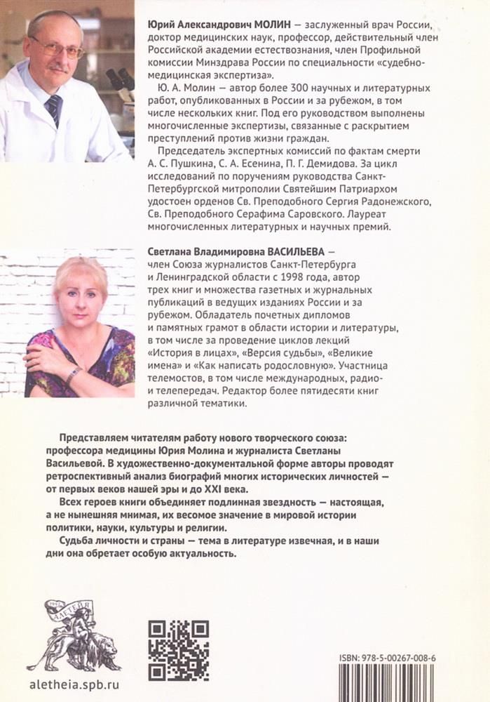Представляем читателям работу нового творческого союза: профессора медицины Юрия Молина и журналиста Светланы Васильевой. В художественно-документальной форме авторы проводят ретроспективный анализ биографий многих исторических личностей — от первых веков нашей эры и до ХХI века.
