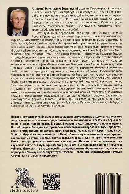Новую книгу Анатолия Вершинского составили стихотворные раздумья о духовном содержании нашего земного существования, о подвижниках и святынях веры, о её месте в сегодняшней жизни. В первый раздел вошли лирические произведения. Второй раздел объединил исторические повествования и предания. Здесь представлены, в меру разумения автора, Пречисиая Дева Мария, Иоанн Креститель, Иисус Христос, Иуда Искариот, евангелисты Нового Завета, мученики первых веков христианства, святые русские князья.