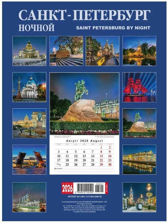 Настенный календарь "Ночной Санкт-Петербург" на 2026 год дает яркое представление о феерической красоте Северной столицы, озаренной огнями ночной иллюминации, тем более что календарь знакомит с самыми эффектными местами города, запечатленными его лучшими фотомастерами.