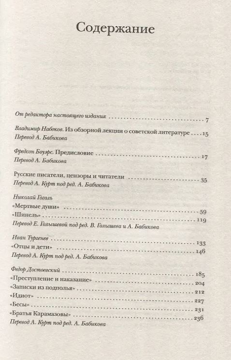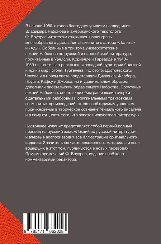 Настоящее издание представляет собой первый полный перевод на русский язык "Лекций по русской литературе" и впервые воспроизводит все иллюстрации оригинального издания. Значительная часть лекционного материала и эссе, вошедших в этот том, публикуются в новых переводах. Помимо примечаний Ф. Боуэрса, издание снабжено комментариями редактора.