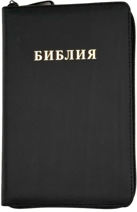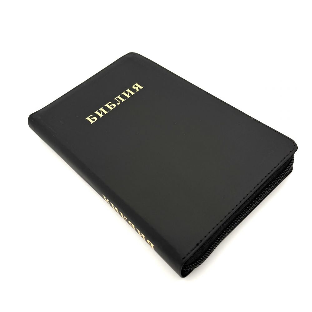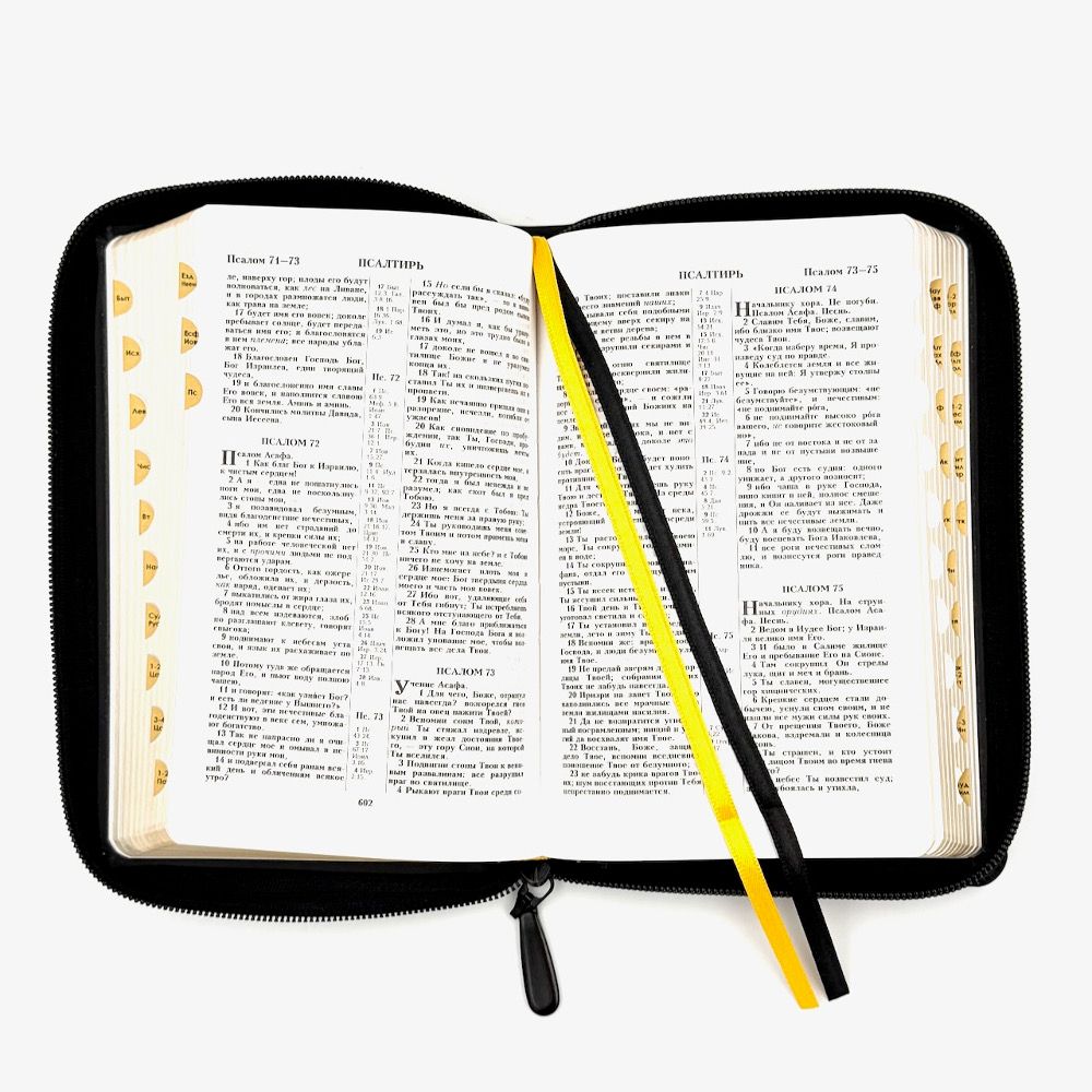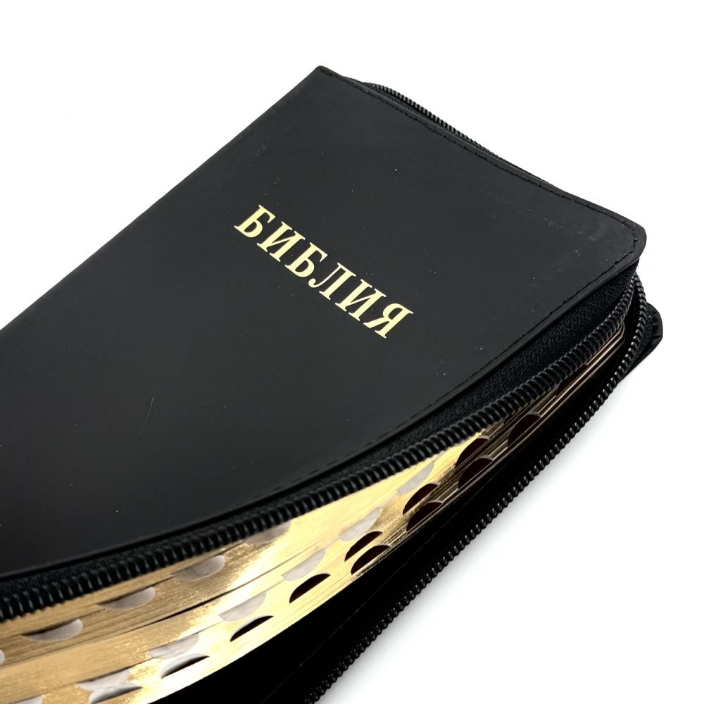 Дизайн "Библия", кожаный переплет на молнии, индексы-указатели, цвет черный, золотой обрез, 2 закладки,