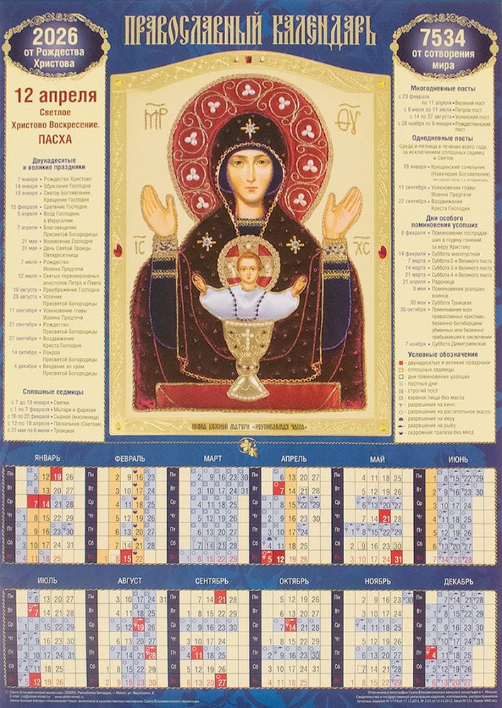 В православном листовом календаре формата А3 на 2026 год представлена икона Пресвятой Богородицы «Неупиваемая Чаша» с золотым тиснением, выполненная в художественных мастерских Свято-Елисаветинского монастыря, а также календарная сетка, в которой указаны двунадесятые и великие праздники, многодневные и однодневные посты, сплошные седмицы, порядок трапезы, дни особого поминовения усопших.