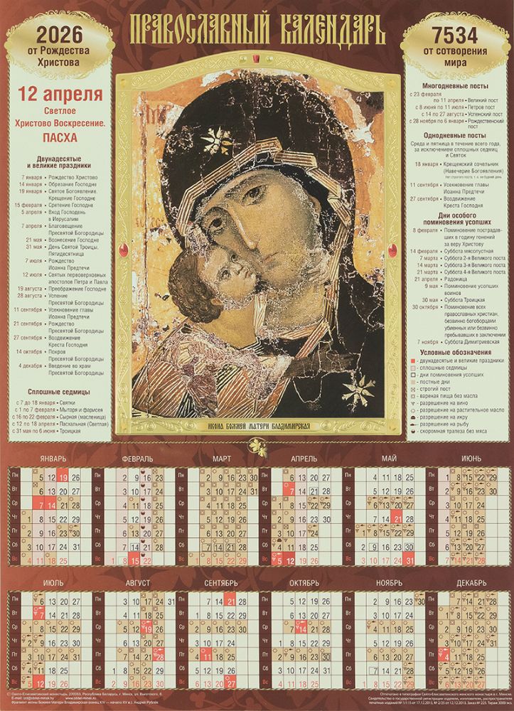 В православном листовом календаре формата А3 на 2026 год представлена икона Пресвятой Богородицы «Владимирская» с золотым тиснением, выполненная в художественных мастерских Свято-Елисаветинского монастыря, а также календарная сетка, в которой указаны двунадесятые и великие праздники, многодневные и однодневные посты, сплошные седмицы, порядок трапезы, дни особого поминовения усопших.