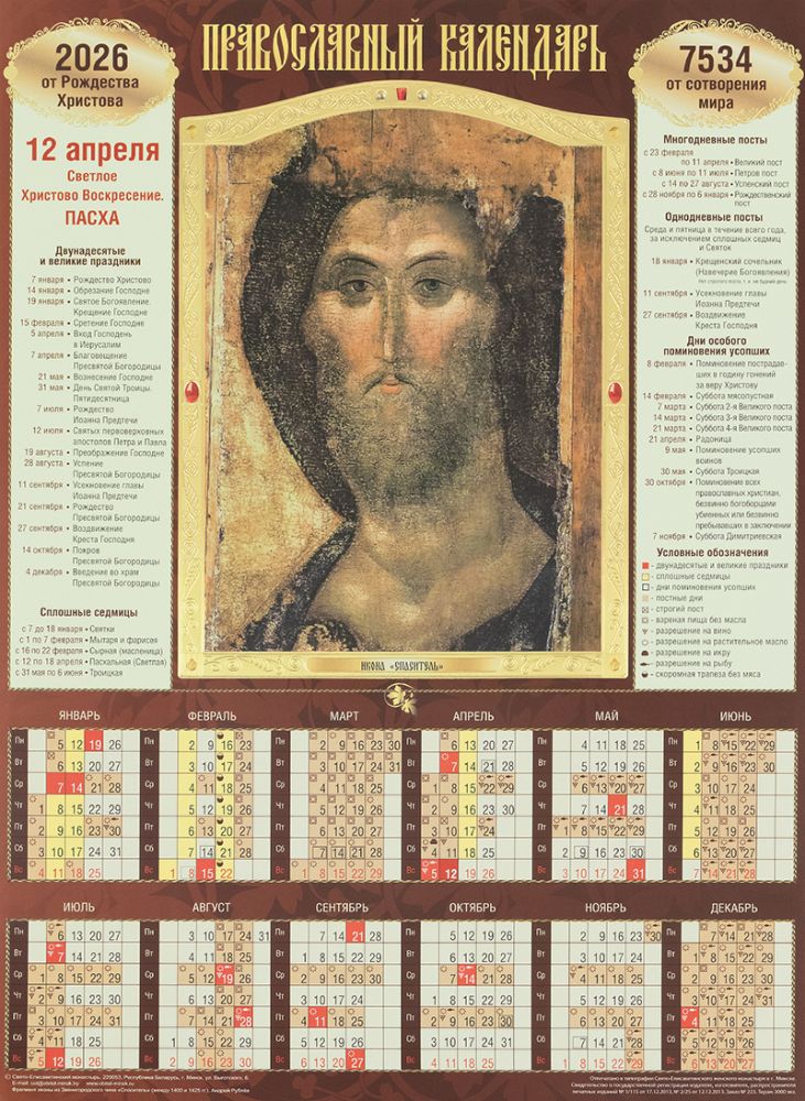 В православном листовом календаре формата А3 на 2026 год представлена икона Спасителя из Звенигородского чина с золотым тиснением, а также календарная сетка, в которой указаны двунадесятые и великие праздники, многодневные и однодневные посты, сплошные седмицы, порядок трапезы, дни особого поминовения усопших.