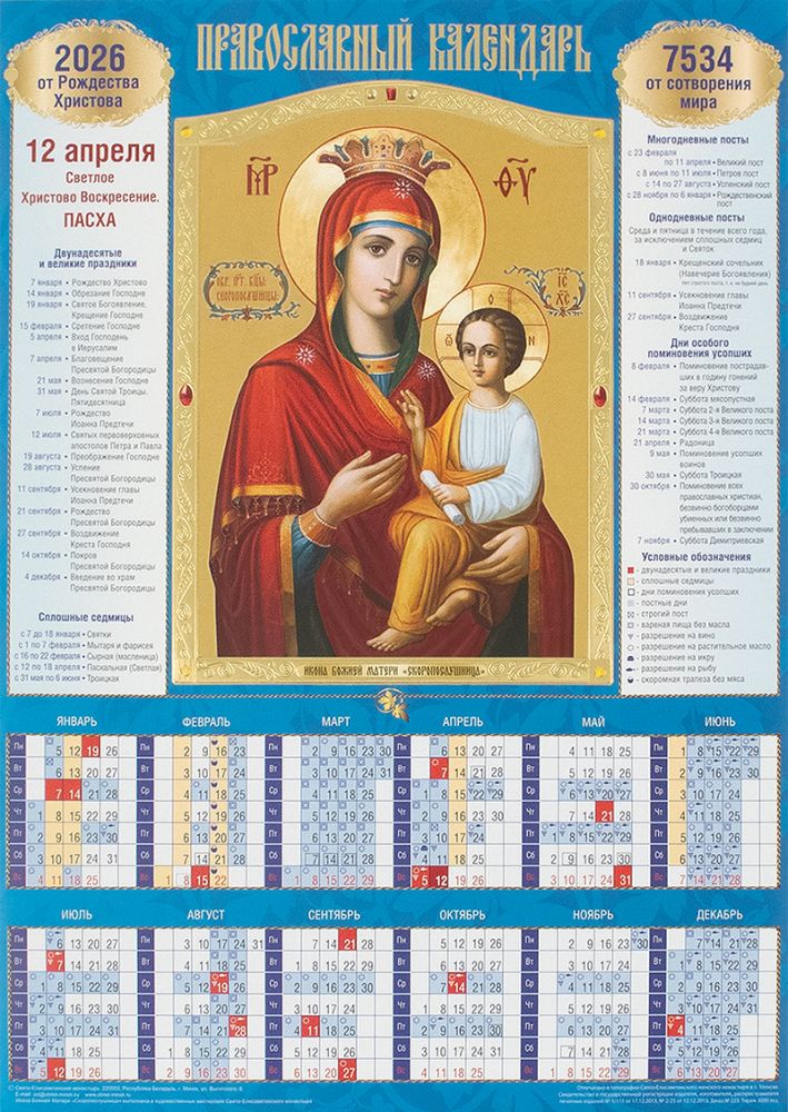 В православном листовом календаре формата А3 на 2026 год представлена икона Пресвятой Богородицы «Скоропослушница» с золотым тиснением, выполненная в художественных мастерских Свято-Елисаветинского монастыря, а также календарная сетка, в которой указаны двунадесятые и великие праздники, многодневные и однодневные посты, сплошные седмицы, порядок трапезы, дни особого поминовения усопших.