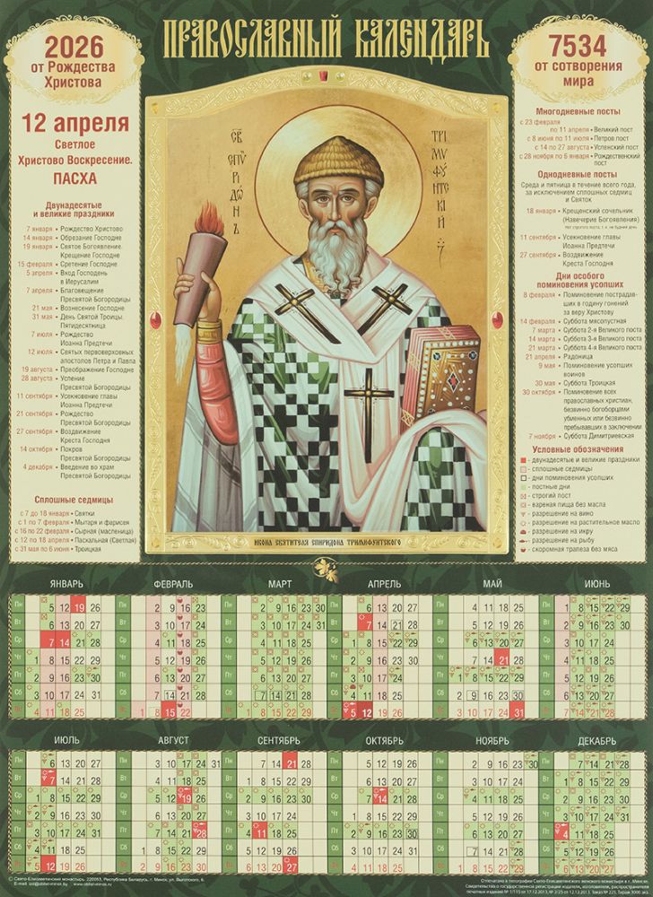 В православном листовом календаре формата А3 на 2026 год представлена икона святителя Спиридона Тримифунтского с золотым тиснением, а также календарная сетка, в которой указаны двунадесятые и великие праздники, многодневные и однодневные посты, сплошные седмицы, порядок трапезы, дни особого поминовения усопших.
