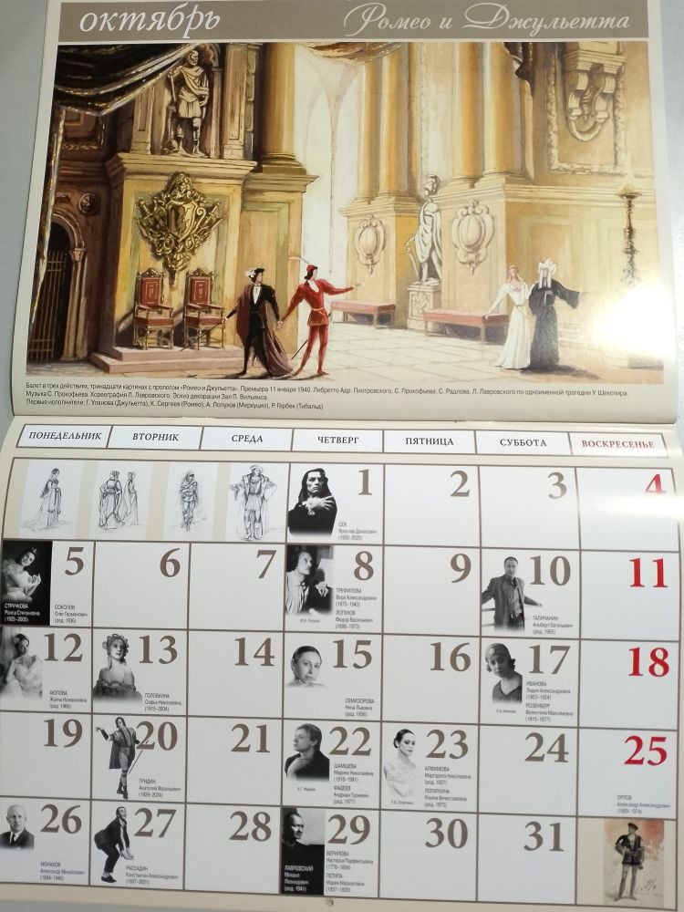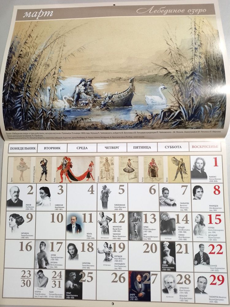 Замечательный настенного календарь, который станет неоценимым подарком для любителей великого искусства балета. Календарь, в котором указаны даты рождения известных деятелей балета, в клеточках дней помещены их портреты. На каждый месяц года - шедевр - эскиз декорации и по нескольку эскизов костюмов самых великих балетов