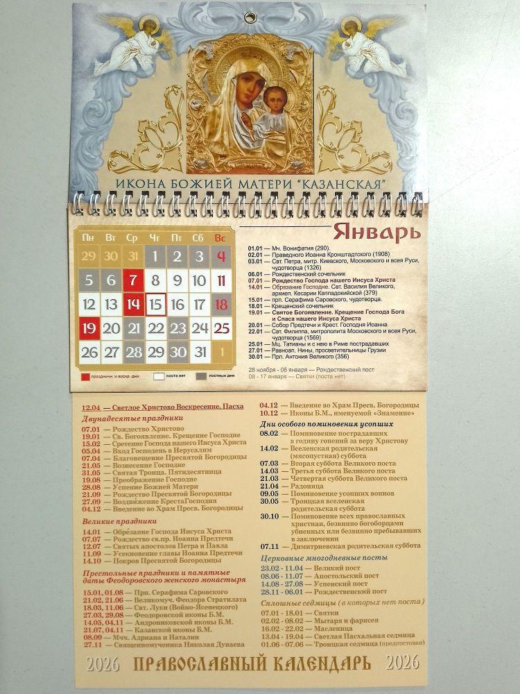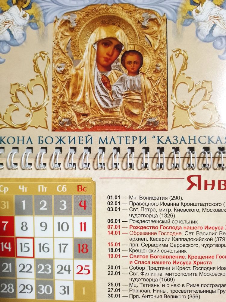 Небольшой настенный православный отрывной ежемесячник. Очень удобен, не занимает много места, помогает легко ориентироваться в памятных, праздничных и постных днях. Спокойная, умиротворяющая гамма. Изображение иконы Казанской Богоматери в старинном изводе...