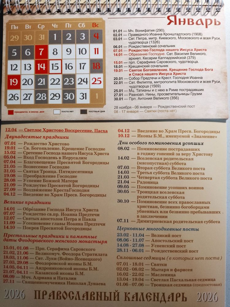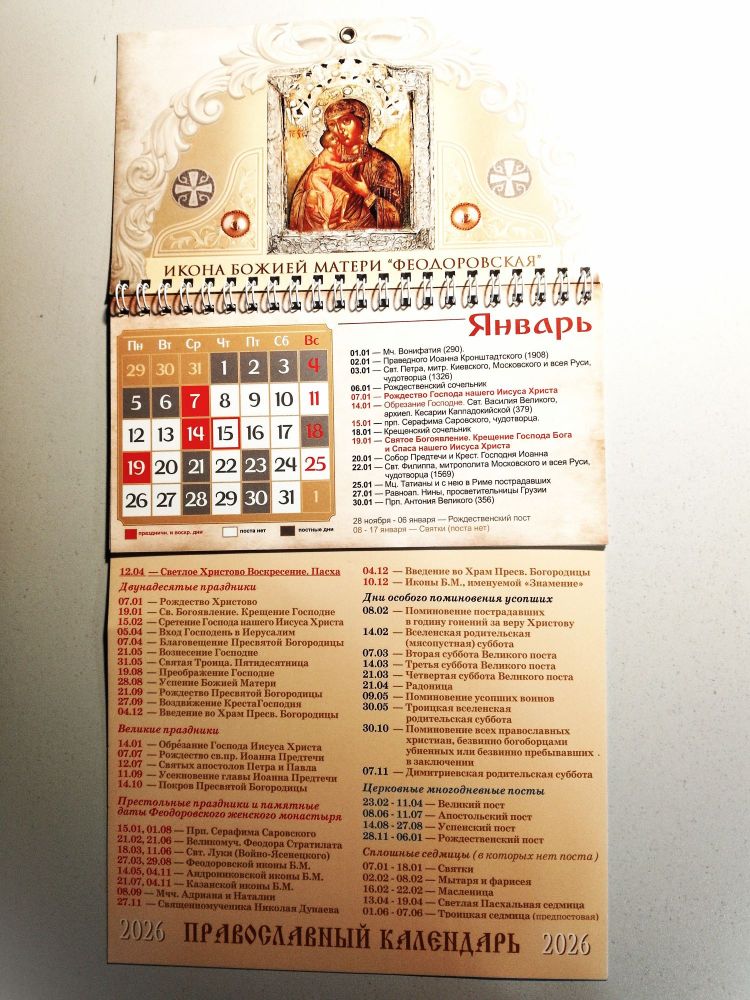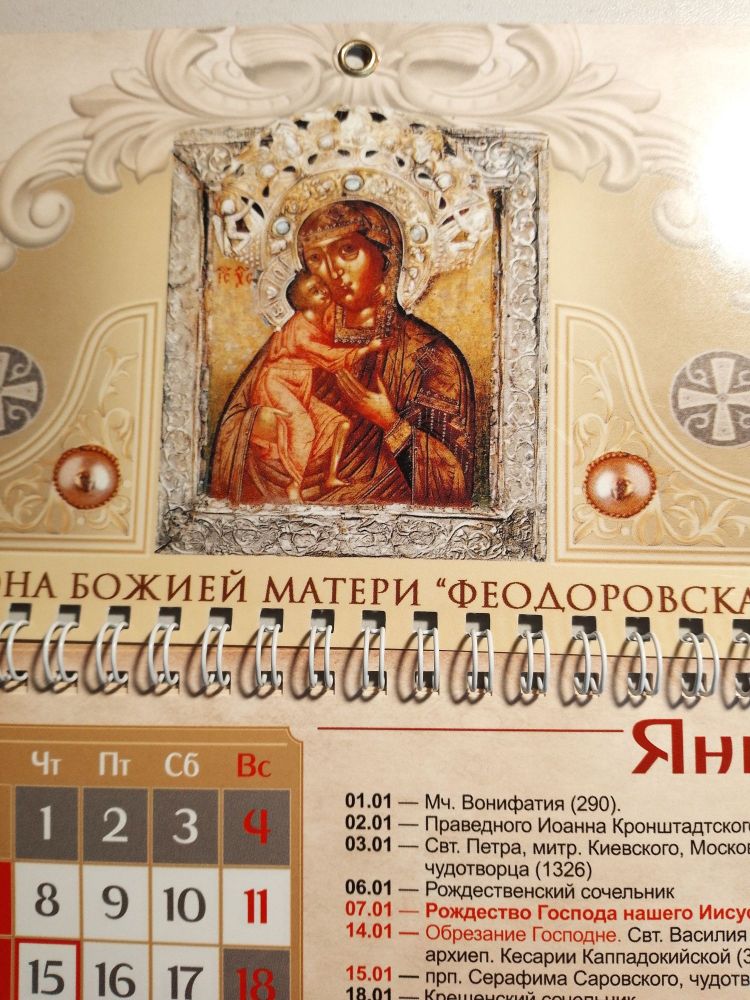 Небольшой настенный православный отрывной ежемесячник. Очень удобен, не занимает много места, помогает легко ориентироваться в памятных, праздничных и постных днях. Спокойная, умиротворяющая гамма. Изображение иконы Феодоровской Богоматери в старинном изводе...