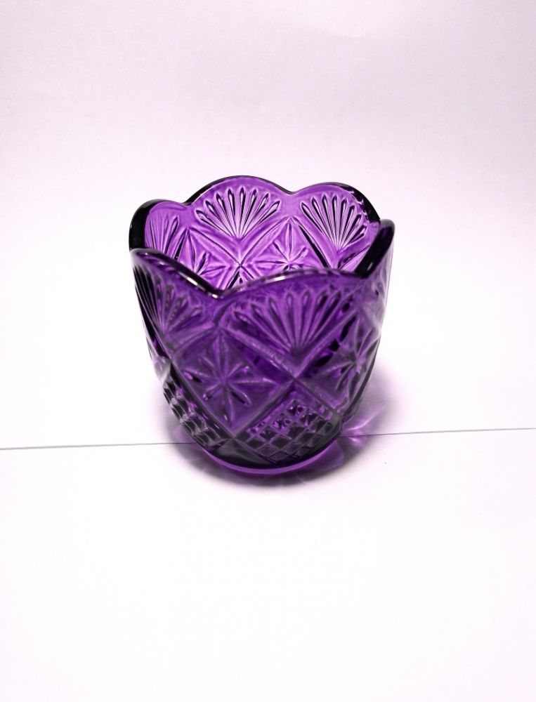 Стакан лампадный, художественная грань. Стекло фиолетовое... У нас можно докупить всё, что сделает из стакана полноценную лампадку - поплавок-фитиледержатель, фитиль, масло лампадное, и даже чашечку для ладана ("паучок"), располагающуюся на ножках, опирающихся на края лампадки над пламенем.