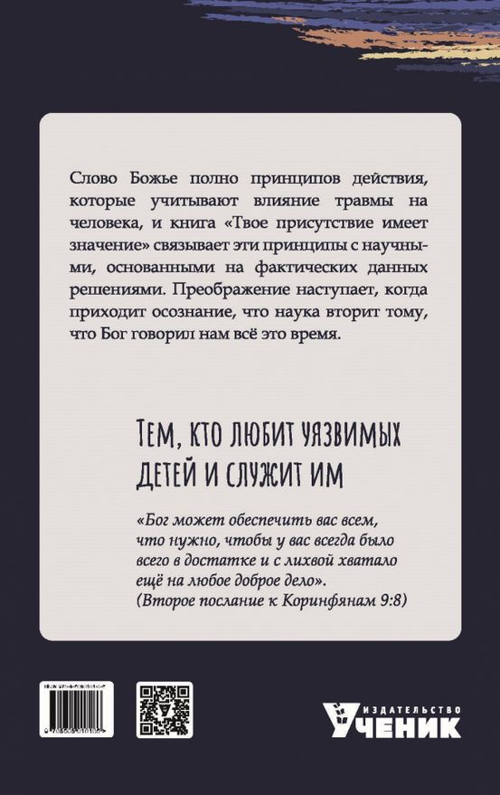 Слово Божье полно принципов действия, которые учитывают влияние травмы на человека, и книга «Твое присутствие имеет значение» связывает эти принципы с научными, основанными на фактических данных решениями. Преображение наступает, когда приходит осознание, что наука вторит тому, что Бог говорил нам всё это время.
