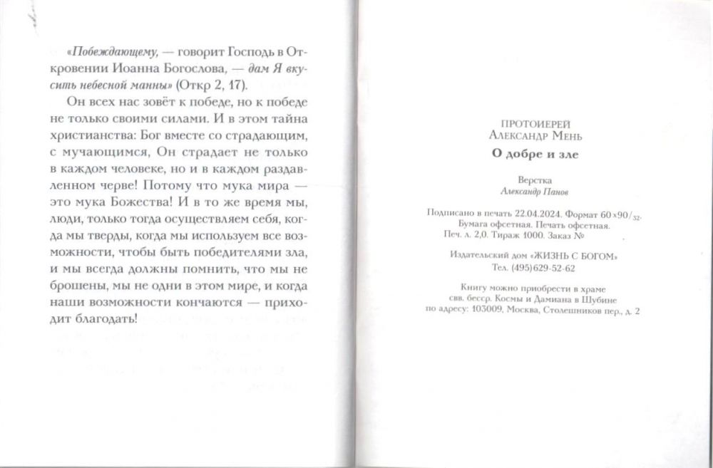 В этой брошюре читателю предлагается три небольших отрывка из статей протоиерея Александра Меня. В предлагаемых текстах о. Александр делится своими размышлениями о проблеме зла.
