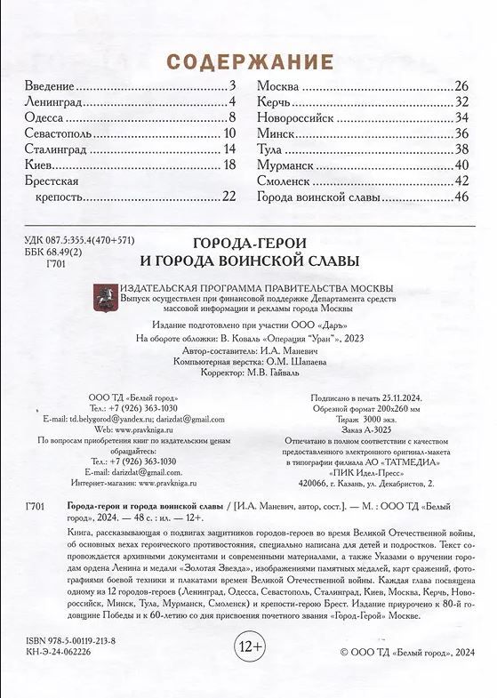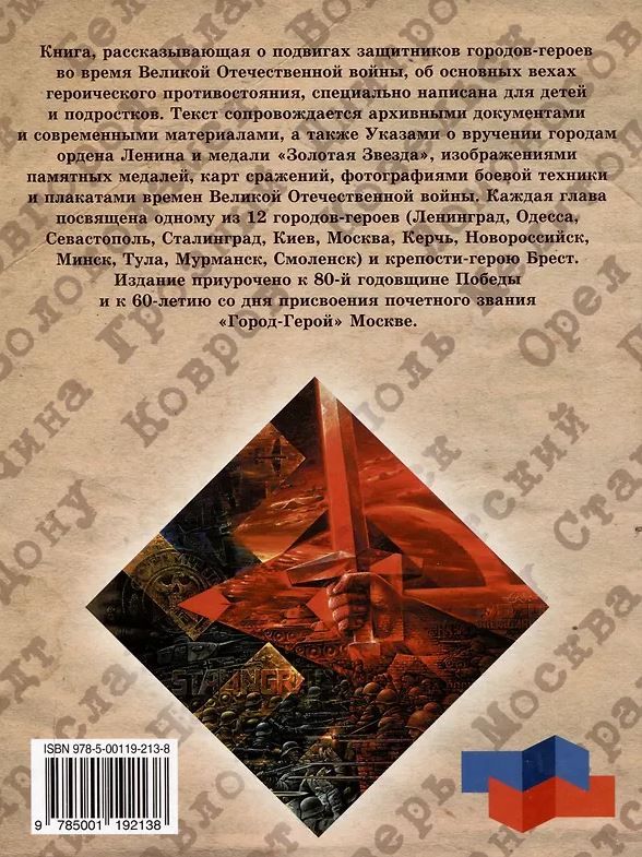 Книга, рассказывающая о подвигах защитников городов-героев во время Великой Отечественной войны, об основных вехах героического противостояния, специально написана для детей и подростков. Текст сопровождается архивными документами и современными материалами, а также Указами о вручении городам ордена Ленина и медали "Золотая Звезда", изображениями памятных медалей, карт сражений, фотографиями боевой техники и плакатами времен Великой Отечественной войны. Каждая глава посвящена одному из 12 городов-героев (Ленинград, Одесса, Севастополь, Сталинград, Киев, Москва, Керчь, Новороссийск, Минск, Тула, Мурманск, Смоленск) и крепости-герою Брест. Издание приурочено к 80-й годовщине Победы и к 60-летию со дня присвоения почетного звания "Город-Герой" Москве.