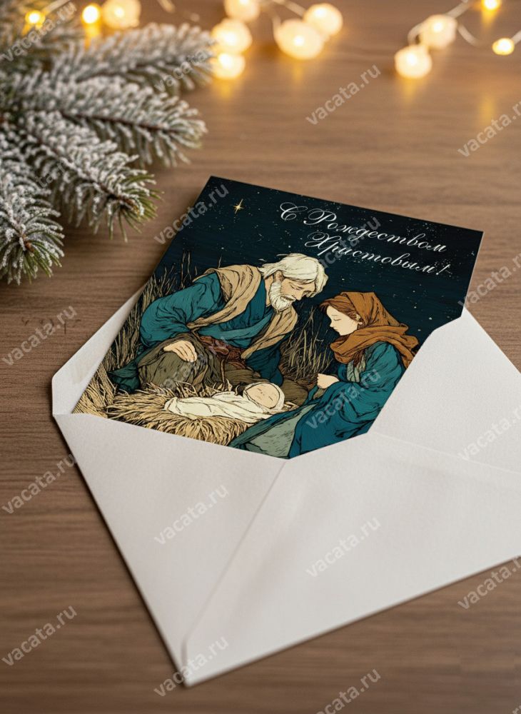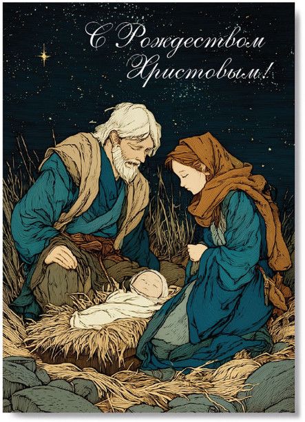 Открытка с надписью «С Рождеством Христовым!» и изображением Марии, Иосифа и Младенца в яслях сделана нами для того, чтобы вы могли поздравить родных, друзей и коллег с праздником, одним из самых любимых и долгожданных. Открытка наполнена атмосферой тишины, мира и чуда. На обороте открытки — четверостишие: