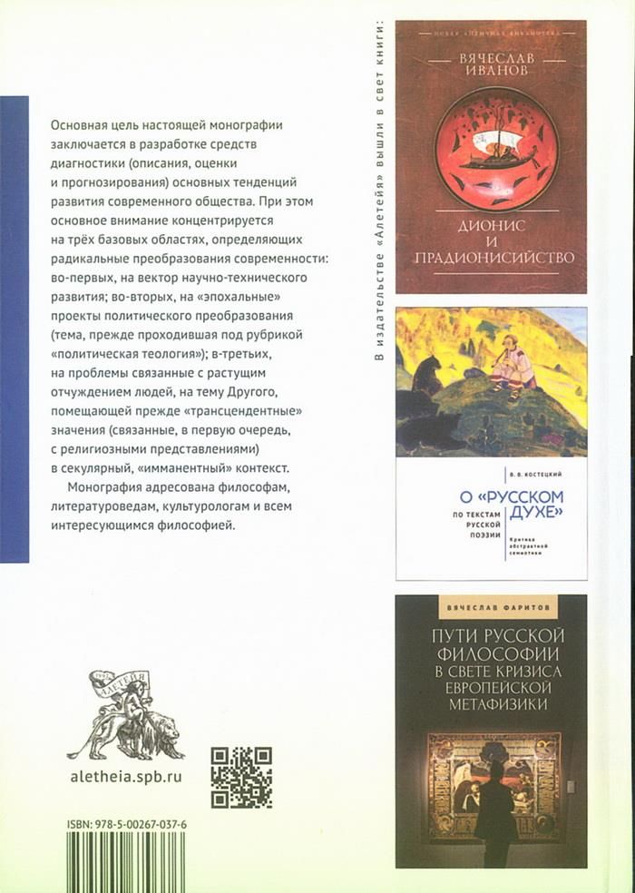 Основная цель настоящей монографии заключается в разработке средств диагностики (описания, оценки и прогнозирования) основных тенденций развития современного общества. При этом основное внимание концентрируется на трех базовых областях, определяющих радикальные преобразования современности: во-первых, на векторе научно-технического развития; во-вторых, на проектах политического преобразования в его «эпохальном» масштабе (тема, прежде проходившая под рубрикой «политическая теология»); в-третьих, на проблемах, связанных с растущим отчуждением людей, подстрекаемым развитием темы Другого, помещающей прежде «трансцендентные» значения (связанные, в первую очередь, с религиозными представлениями) в секулярный, «имманентный» контекст.