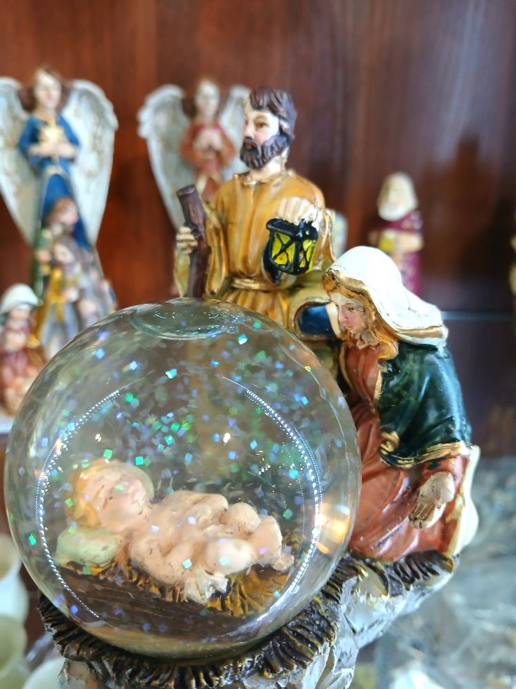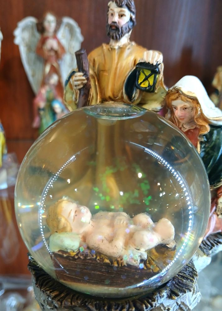 Композиция Рождество. Три фигурки на основании. Младенец в стеклянном шаре.