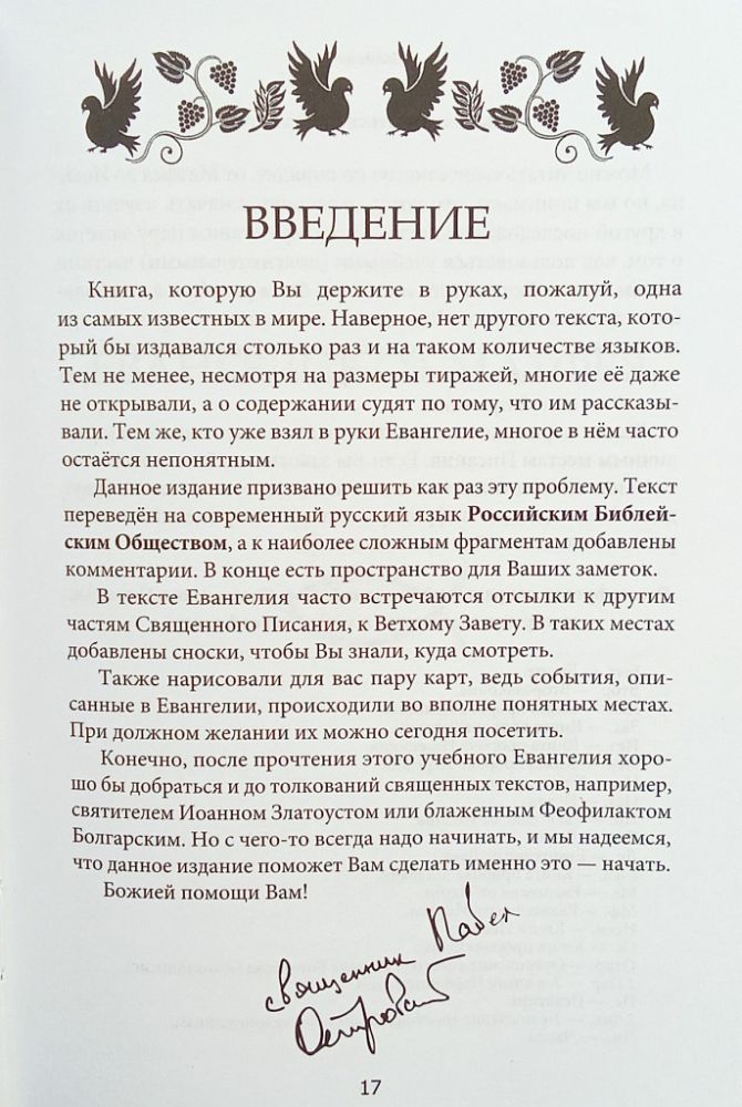 «Конечно, после прочтения этого учебного Евангелия хорошо бы добраться и до толкований священных текстов, например, святителем иоанном Златоустом или блаженным Феофилактом Болгарским. Но с чего-то всегда надо начинать, и мы надеемся, что данное издание поможет Вам сделать именно это – начать. Божией помощи вам! Священник Павел Островский» (из Введения к изданию)