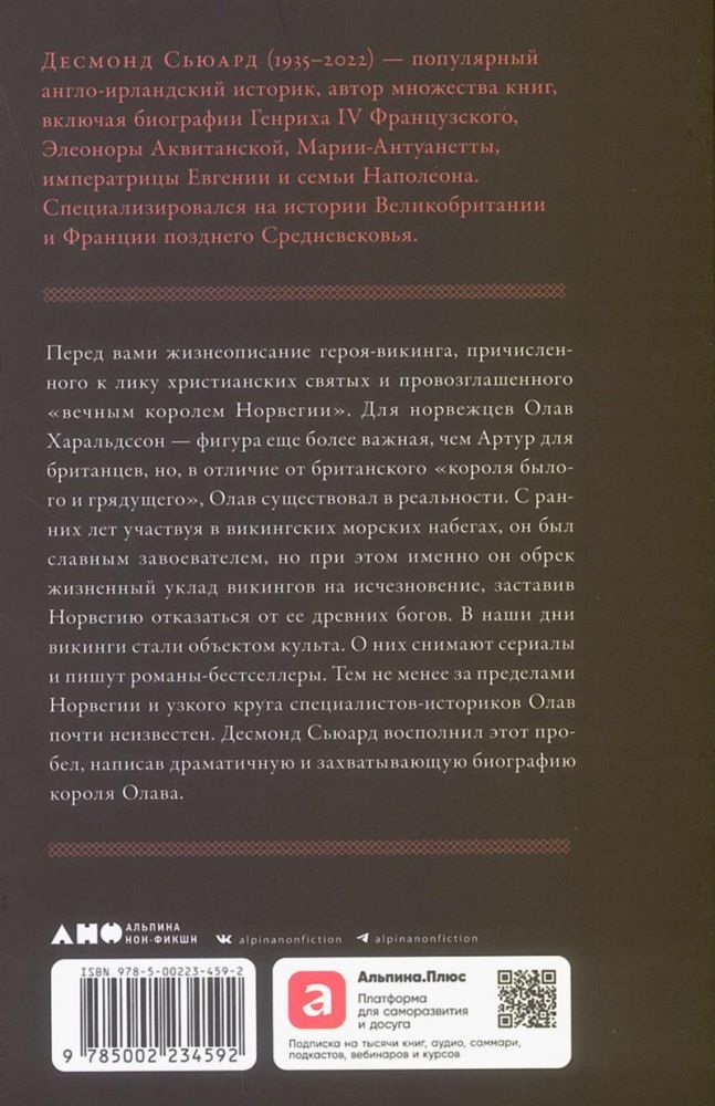 Перед вами жизнеописание героя-викинга, причисленного к лику христианских святых и провозглашенного «вечным королем Норвегии». Для норвежцев Олав Харальдссон — фигура еще более важная, чем Артур для британцев, но, в отличие от британского «короля былого и грядущего», Олав существовал в реальности. С ранних лет участвуя в викингских морских набегах, он был славным завоевателем, но при этом именно он обрек жизненный уклад викингов на исчезновение, заставив Норвегию отказаться от ее древних богов. В наши дни викинги стали объектом культа. О них снимают сериалы и пишут романы-бестселлеры. Тем не менее, за пределами Норвегии и узкого круга специалистов-историков Олав почти неизвестен. Десмонд Сьюард восполнил этот пробел, написав драматичную и захватывающую биографию короля Олава.