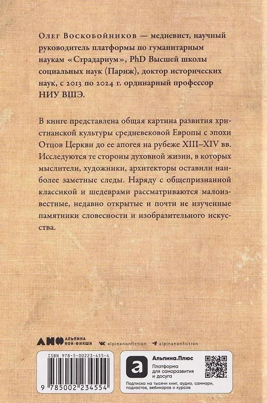 В книге представлена общая картина развития христианской культуры средневековой Европы с эпохи Отцов Церкви до ее апогея на рубеже XIII–XIV вв. Исследуются те стороны духовной жизни, в которых мыслители, художники, архитекторы оставили наиболее заметные следы. Наряду с общепризнанной классикой и шедеврами рассматриваются малоизвестные, недавно открытые и почти не изученные памятники словесности и изобразительного искусства. Описание и анализ конкретных произведений сопровождают авторские трактовки общих тенденций развития культуры и подкреплены научным аппаратом. Для историков философии, литературы, искусства, культурологов, всех интересующихся историей европейской культуры.
