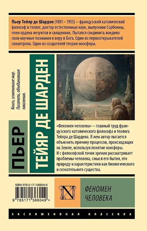 "Феномен человека" — главный труд французского католического философа и теолога Тейяра де Шардена. В нем автор пытается объяснить причину процессов, происходящих на Земле, используя понятие ноосферы. И с философской точки зрения рассматривает проблемы человека, смысл его бытия, его природу и характеристики как биологического и сознательного существа.