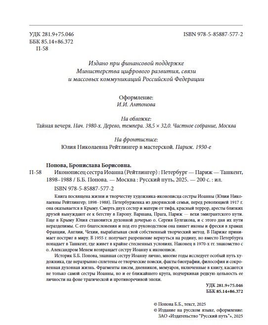 Историк Б.Б. Попова, знавшая сестру Иоанну лично, многие годы исследует особый путь художника, где неразрывно сплетены ее творческие поиски, факты биографии, философия и сокровенная духовная жизнь. Фрагменты писем, дневников, мемуаров, включенные в книгу, касаются не только самой сестры Иоанны, но и ее ближайшего круга, подчеркивая редкую цельность ее личности на фоне трагической и противоречивой эпохи.