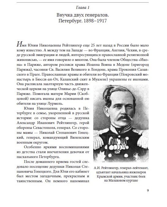 Книга посвящена жизни и творчеству художника-иконописца сестры Иоанны (Юлии Николаевны Рейтлингер; 1898–1988). Петербурженка из дворянской семьи, перед революцией 1917 г. она оказывается в Крыму. Смерть двух сестер и матери от тифа, красный террор, аресты близких друзей вынуждают ее к бегству в Европу. Варшава, Прага, Париж — вехи эмигрантского пути. Еще в Крыму Юлия становится духовной дочерью о. Сергия Булгакова, и с этого дня их пути неразделимы. С его благословения и под его руководством она пишет иконы и фрески в храмах Франции, Англии, Чехии, вырабатывая свой собственный творческий метод. В Париже принимает постриг в миру. В 1955 г. получает разрешение вернуться на родину, но вместо Петербурга попадает в Ташкент, где живет в крайне стесненных условиях. Наконец в 1970-х гг. знакомство с о. Александром Менем возвращает сестру Иоанну к иконописи.