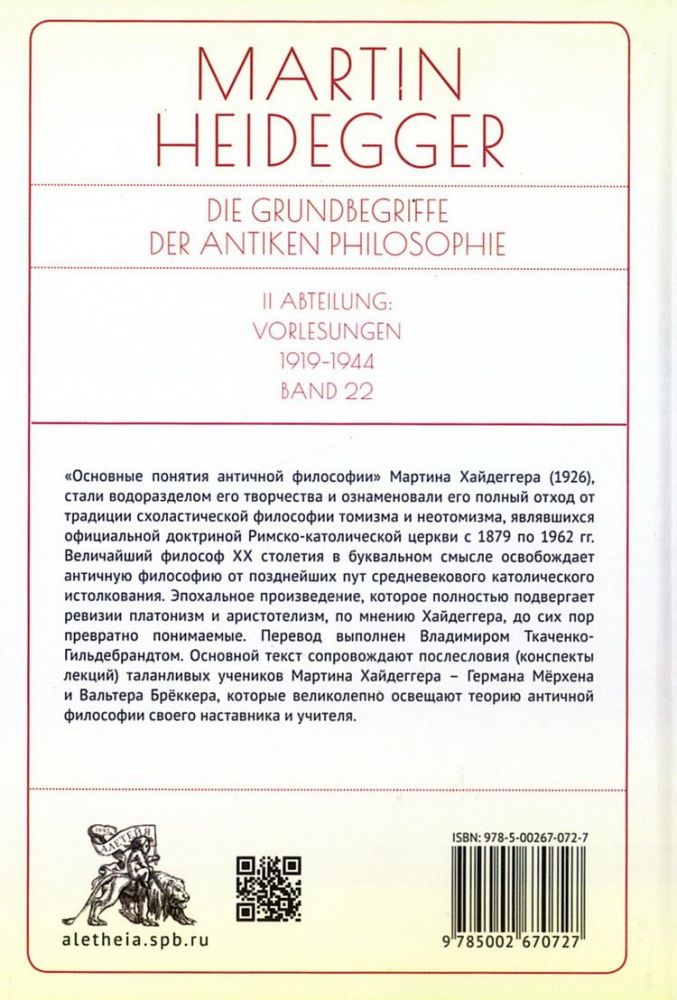 которое полностью подвергает ревизии платонизм и аристотелизм, по мнению Хайдеггера, до сих пор превратно понимаемые. Перевод выполнен Владимиром Ткаченко-Гильдебрандтом. Основной текст сопровождают послесловия (конспекты лекций) таланливых учеников Мартина Хайдеггера — Германа Мёрхена и Вальтера Брёккера, которые великолепно освещают теорию античной философии своего наставника и учителя.