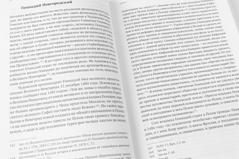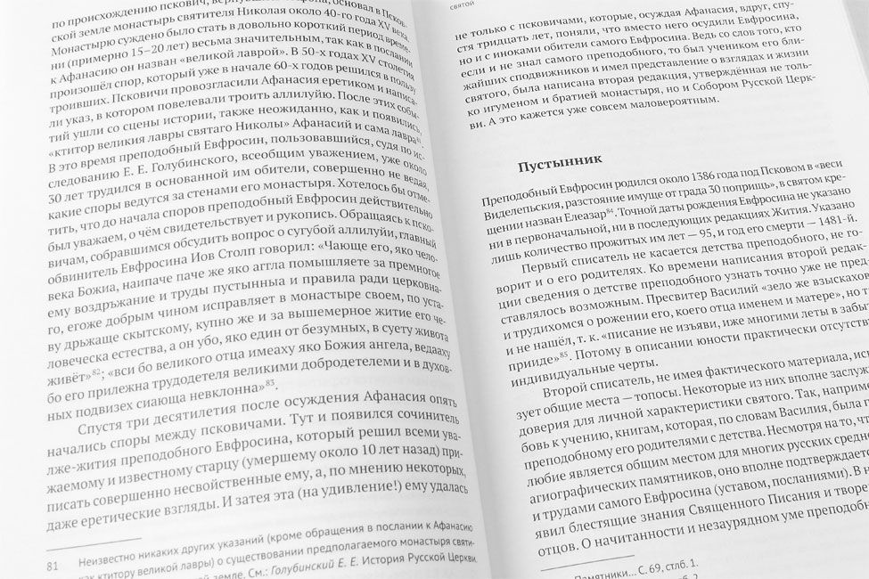 Книга представляет собой комплексное фундаментальное исследование, связанное с одним из основных направлений современной медиевистики — славянской агиографией. Первая часть книги посвящена личности преподобного Евфросина Псковского и тем перипетиям его судьбы, которые случались с ним как при жизни, так и после смерти. Большую часть своего чрезвычайно сложного и трагичного бытия Евфросин слыл у подавляющего большинства псковского общества еретиком. Преподобный сопротивлялся несправедливому ярлыку. Снять этот ярлык при жизни ему так и не удалось. За него это сделала смерть в 1481 году. Однако, спустя примерно еще два столетия, на него вновь был повешен ярлык еретика — теперь уже Московским патриархом Никоном в пылу полемики с защитниками старого обряда. Со второй половины XVII века начинается литературная война за память об отшельнике. Результаты этой двухсотлетней войны были неожиданны для всех. Василий Осипович Ключевский в 60-х годах XIX столетия обнаружил в рукописном собрании Соловецкого монастыря, хранящемся тогда в Казанской духовной академии, первоначальную редакцию Жития Евфросина Псковского, которая изменила представления как о фактической стороне жизни отшельника и его еретичестве, так и об этикетности в древнерусской агиографии, чему и посвящена вторая часть книги.
