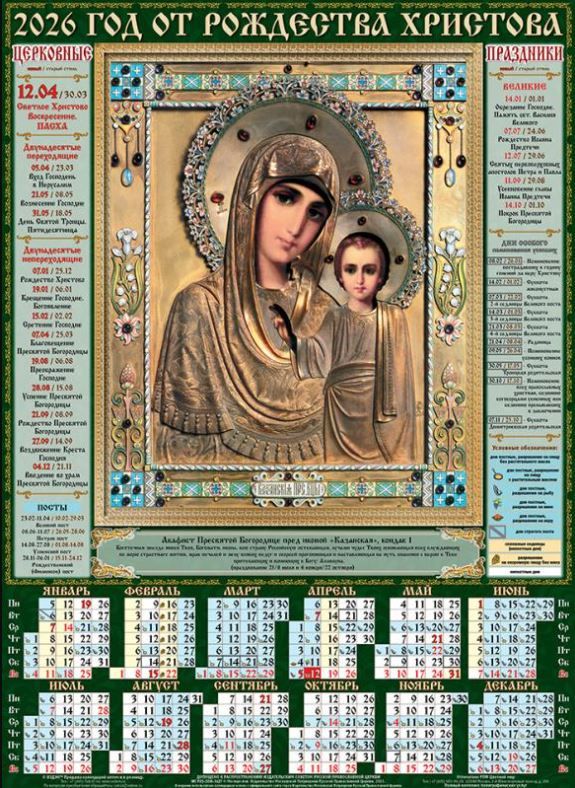 Календарь листовой православный на 2026 год тонкий «Казанская икона Б.М. в окладе»