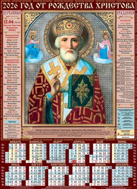 Календарь листовой православный на 2026 год тонкий «Святитель Николай»