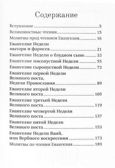 В данном издании приводятся краткие и общедоступные толкования евангельских чтений, которые произносятся в воскресные дни Великого поста, а также на четырех Неделях, предшествующих Великому посту. Сначала приводится само евангельское чтение данного воскресного дня на церковнославянском и русском языках, затем, если в нем есть места, требующие разъяснения, они растолковываются, наконец, из чтения выводятся поучительные наставления для нашей жизни и деятельности.